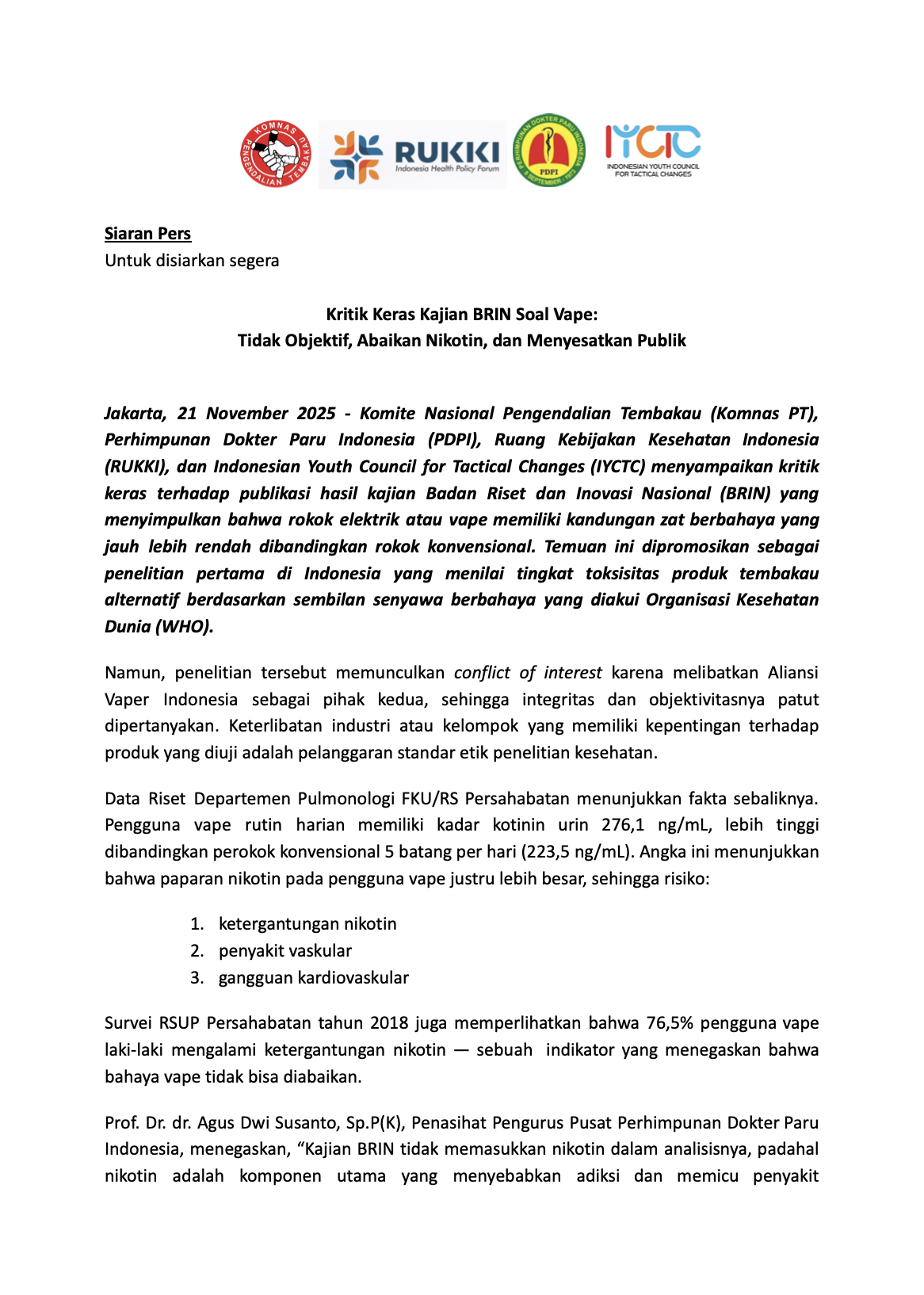 Prof. Dr. dr. Agus Dwi Susanto, Sp.P(K), Penasihat Pengurus Pusat Perhimpunan Dokter Paru Indonesia, menegaskan, “Kajian BRIN tidak memasukkan nikotin dalam analisisnya, padahal nikotin adalah komponen utama yang menyebabkan adiksi dan memicu penyakit kardiovaskular, stroke, serta penyempitan pembuluh darah. Tanpa menilai nikotin, tidak bisa disimpulkan bahwa rokok elektronik lebih tidak berbahaya.”